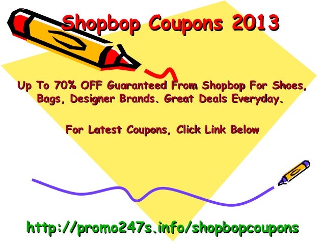 Verified 15% Off - Shopbop Coupon Codes for May 2022 Active Shopbop Australia Promo, Discount and Coupon Codes for May 2022 Coupon Verified 15% Off Your First Order at Shopbop Use the code and save 15% on your first order at Shopbop. Get Coupon Terms Verified : This coupon has been recently verified working. Coupon Verified Extra 25% off Sale at Shopbop
