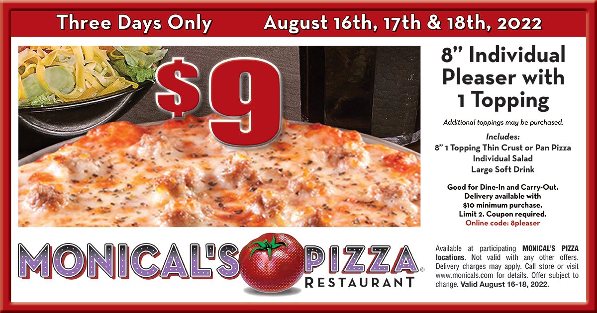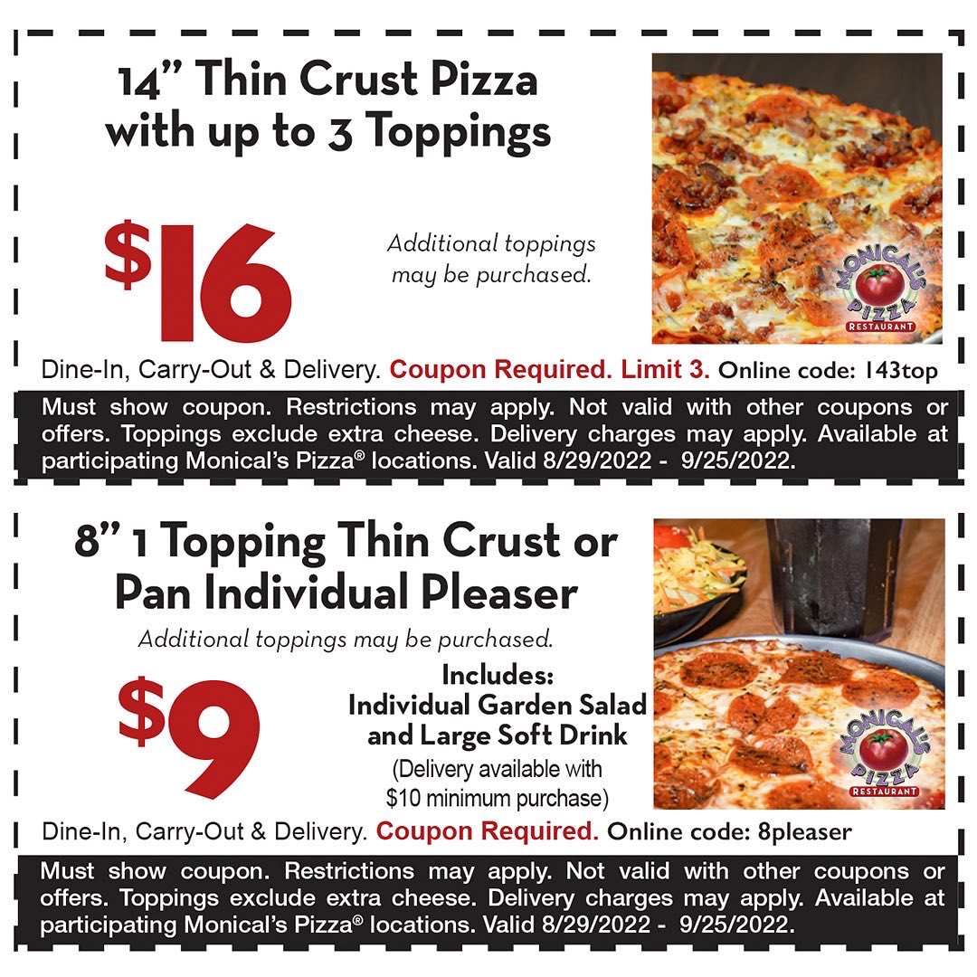 Monical's Pizza Coupons & Promo codes (Oct, 2022) Copy And Paste Monical's Coupon Code, And Get 14'' thin Crust up to 3 Toppings for $20 at MonicalPizza.com. GET COUPON ONLY $21.50 COUPON Combo Deal: Grab Your 14 Inch Thin Crust 3-Topping Family Pleaser + Family Garden Salad + Softdrinks Only for $21.50