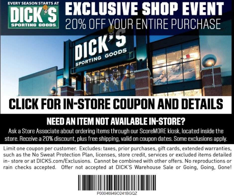 DICK'S Sporting Goods Coupons & Promo Codes: In-Store & Online Sales Find DICK'S Sporting Goods coupons & promo codes for deals on athletic apparel, footwear and sports equipment. Browse all DICK'S Sporting Goods coupons & promo codes so you can save big on the gear you love. ... Shipping offers do not apply to personalized products or bulk orders. Due to package size restrictions from UPS, some large or bulky ... Dick's 20% Coupon Printable Promo Code | Frugalpapa October 2022 Dick's Sporting Goods coupon code are seldom accessible, but while they are, it often provide additional savings of up to 20%. You may also go to the site to see time constrained offers that can aid you to get savings up to 70%. Browse Dick's Sporting Goods' Quick Offers area to get savings of up to 60% off.